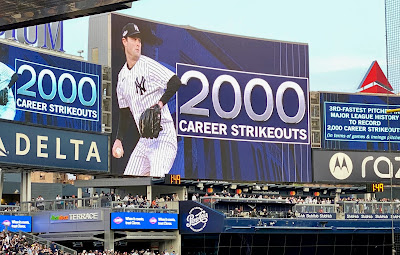 My first Yankees game since the pandemic finished in grand style last night with a come-from-behind, game-tying home run by slugger Aaron Judge in the top of the 9th, followed by a walk-off, sacrifice fly by rookie Anthony Volpe in the 10th. Judge and Volpe made up for Gerrit Cole's rare poor outing on the mound. We did see Cole throw his 2,000 career strikeout. Wonder how many were thrown with Spider Tack?